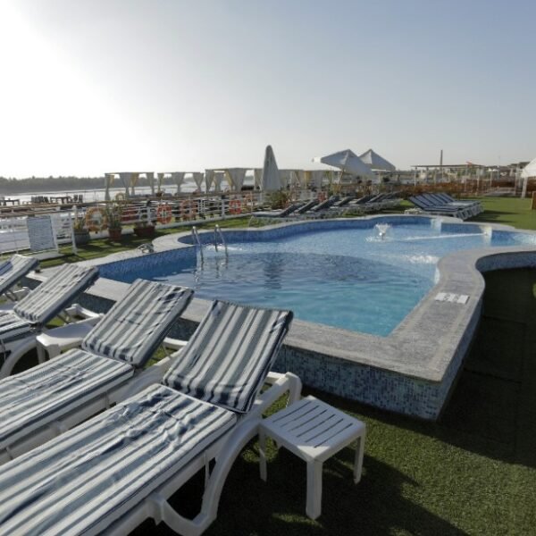 Guests can unwind on the spacious sun deck, featuring a refreshing swimming pool and a pool bar, perfect for soaking up the sun and enjoying peaceful views of the Nile’s timeless landscapes.